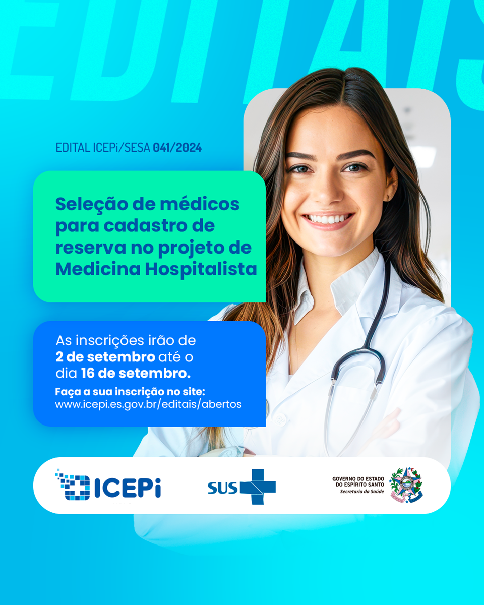 A Secretaria da Saúde (Sesa), por meio do Instituto Capixaba de Ensino, Pesquisa e Inovação em Saúde (ICEPi), lançou edital para seleção de cadastro de reserva de médicos no projeto de Medicina Hospitalista (MH). As inscrições têm início na próxima segunda-feira (02) e vão até o dia 16, pelo site https://icepi.es.gov.br/editais/abertos.