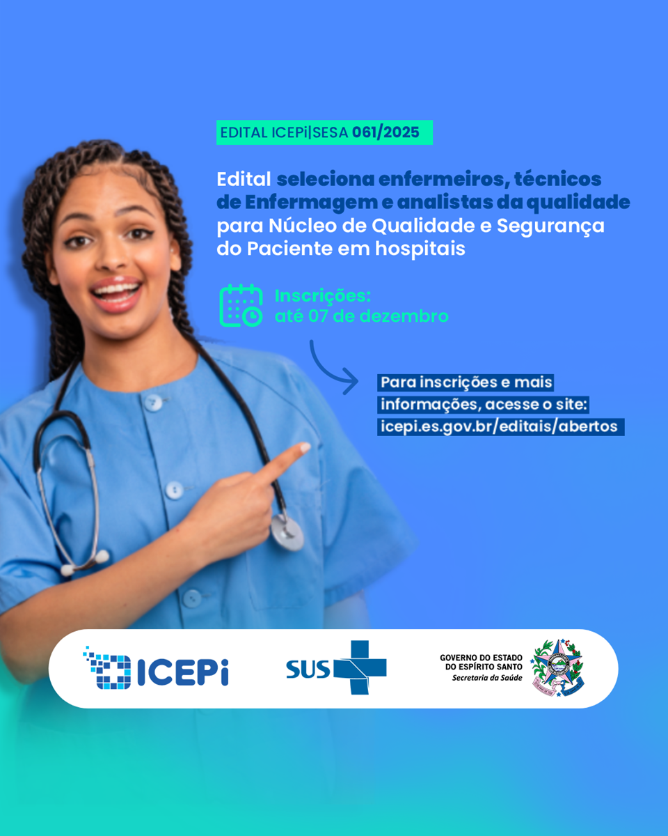 A Secretaria da Saúde (Sesa), por meio do Instituto Capixaba de Ensino, Pesquisa e Inovação em Saúde (ICEPi), lançou na última sexta-feira (14), o edital ICEPi/Sesa nº 061/2025 com cadastro de reserva para enfermeiros, técnicos de Enfermagem e analistas da qualidade em hospitais da rede própria estadual. As inscrições vão até o dia 07 de dezembro, pelo site https://icepi.es.gov.br/editais/abertos, e o edital está disponível no mesmo endereço eletrônico.