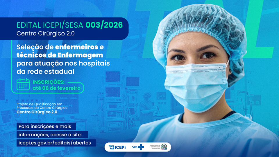 A Secretaria da Saúde (Sesa), por meio do Instituto Capixaba de Ensino, Pesquisa e Inovação em Saúde (ICEPi), abriu inscrições para o edital ICEPi/Sesa nº 003/2026, com cadastro de reserva para enfermeiros e técnicos de Enfermagem destinados à atuação em hospitais da rede própria estadual. As inscrições devem ser realizadas até o dia 08 de fevereiro, por meio do site https://icepi.es.gov.br/editais/abertos, onde também está disponível o edital completo.
