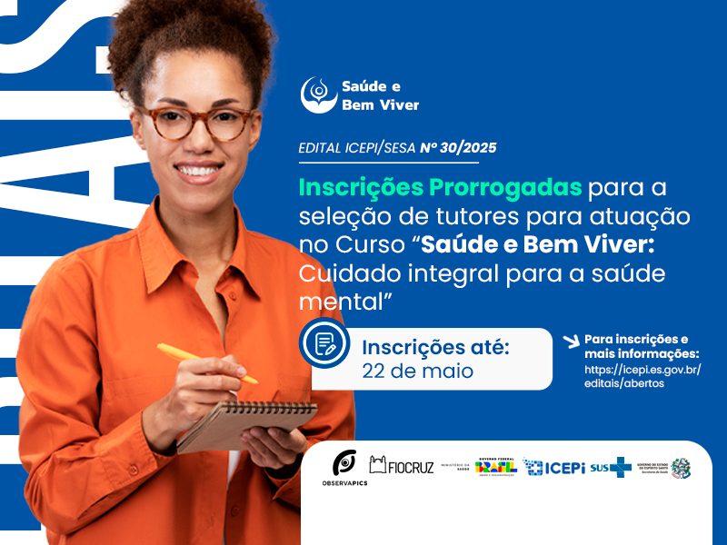 Profissionais de saúde do Sistema Único de Saúde (SUS) têm uma nova oportunidade para se inscrever como tutores do curso “Saúde e Bem Viver: Cuidado Integral para a Saúde Mental”. O prazo foi prorrogado até o dia 22 de maio, e as inscrições podem ser feitas pelo site icepi.es.gov.br/editais/abertos. O edital pode ser consultado no mesmo endereço eletrônico.