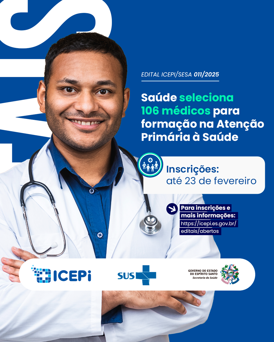 A Secretaria da Saúde (Sesa), por meio do Instituto Capixaba de Ensino, Pesquisa e Inovação em Saúde (ICEPi), lançou, nessa quinta-feira (13), o edital com 106 vagas para médicos em formação na Atenção Primária à Saúde (APS) e cadastro de reserva. As inscrições vão até o dia 23 de fevereiro, pelo site https://icepi.es.gov.br/editais/abertos.
