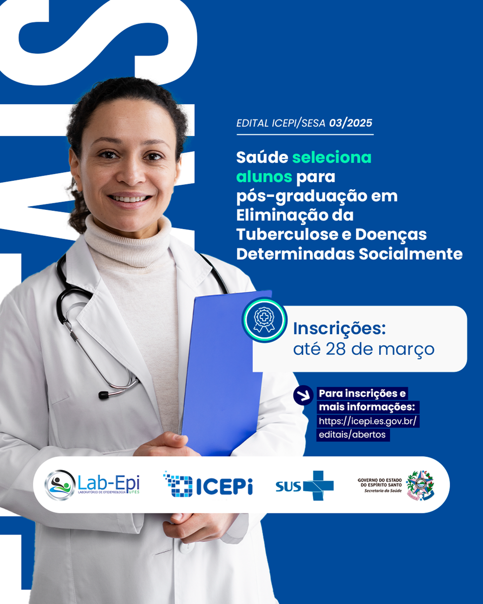 O curso de pós-graduação lato sensu em Eliminação da Tuberculose e Doenças Determinadas Socialmente, ofertado pelo Instituto Capixaba de Ensino, Pesquisa e Inovação em Saúde (ICEPi), está com inscrições abertas até o dia 28 de março. Podem se inscrever servidores de Secretarias Municipais de Saúde e de Assistência Social, das Superintendências Regionais de Saúde e de Assistência Social e das Secretarias Estaduais da Saúde e de Assistência Social.