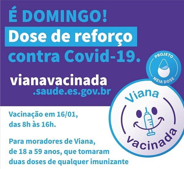 A meia dose já está sendo oferecida em todos os postos de vacinação do município. O Dia D de Mobilização está sendo organizado pela Prefeitura de Viana nos seguintes locais: Cemei Manoel Evêncio de Oliveira, em Nova Bethânia; Cemei Maria de Lourdes Coutinho Passos, em Vila Bethânia; Emef Marcílio de Noronha, em Marcílio de Noronha; Emef Orestes Souto Novaes, em Jucu, e na Emef Padre Antunes Siqueira, em Viana Sede.